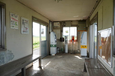| 駅舎内の様子。 簡易Suica改札機(入場用・出場用)、乗車駅証明書発行機、 きっぷ・運賃収受箱が狭いスペースに集約されている。 |