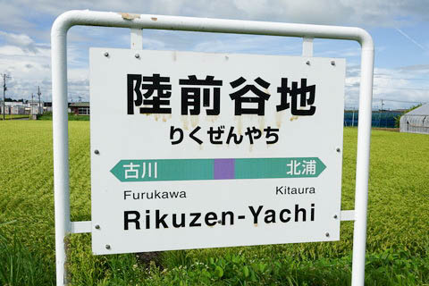| 建植式駅名標。 駅名の由来は開業時の地名 ”小牛田町北浦字谷地” から。 駅開業前の1954年(昭和29年)まで当地は”北浦村字谷地”であった。 駅名に ”陸前” を冠した理由は不明であるが、20km程東に石巻線の前谷地駅が 既にあったことや、駅周囲に”上谷地”、”大谷地”、”谷地”等、複数の ”谷地” が 存在したこと、全国各地に ”谷地” の地名が見られる等が理由であろう。 |