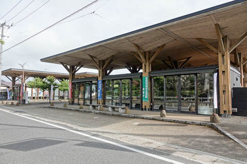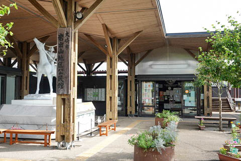 『大崎市岩出山地区公民館』 が開設されている。 写真中央に駅待合室、右端にホーム出入口階段である。 また左手には、2008年(平成20年)3月16日に仙台駅2階コンコースより 『伊達政宗騎馬像』 が移設されている。 |