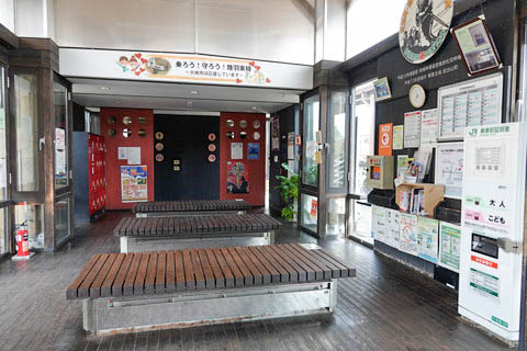 | 待合室内の様子。 正面にトイレ、右手には乗車駅証明書発行機がある。 また、AEDが設置されている。 |