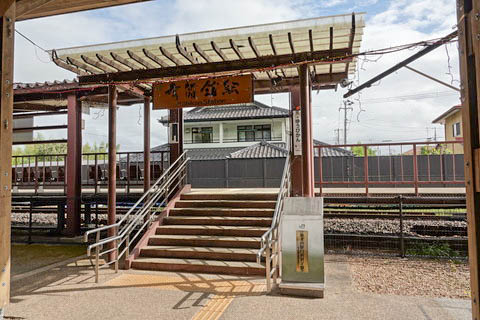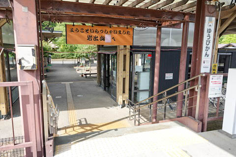 | 駅前の市道より駅方向を見る。 写真ほぼ中央に見える階段がホームへの出入口になっている。 駅舎はないが、観光施設の一部のような雰囲気である。 |