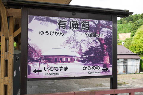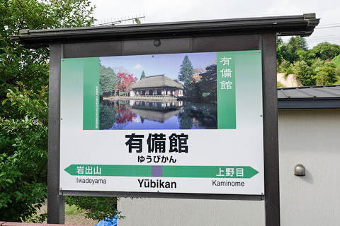 | 建植式駅名標。 秋の有備館 ”御改所(主屋)” がプリントされている。 『有備館』 は江戸時代の仙台藩家臣である岩出山伊達家が開設した郷学(学問所)で、 10代邦直が当主であった1850年(嘉永3年)頃に開設されたと言われている。 駅名はこの史跡名から命名されている。 |