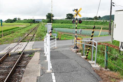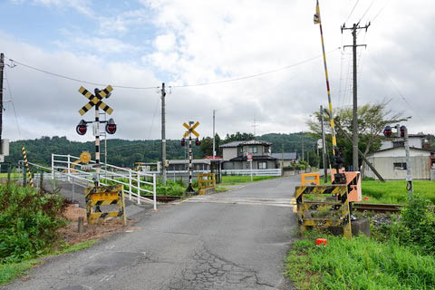 『一の坪踏切』 より、東方向を見る。 この道は、 2006年(平成18年)3月末の大崎市発足以前は、 ”岩出山町道上野目小学校線”であった。 踏切左手に駅出入口、後方100m程に国道108号線である。 踏切の先600m程に市道名である 『上野目小学校』 があったが、 児童数減少により 2018年(平成30年)3月末をもって 『大崎市立岩出山小学校』へ統合されている。 |