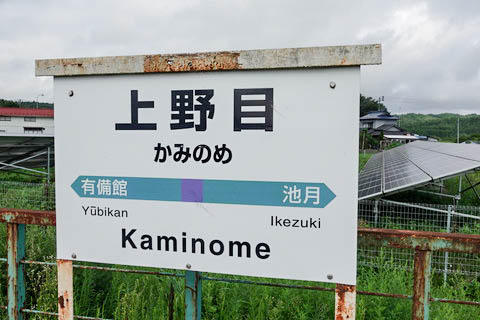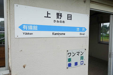 | 建植式駅名標。 当駅は1964年(昭和39年)2月、玉造郡岩出山町下一栗に開業したが、 同町には既に 『岩出山駅』、『上岩出山駅』(後の西大崎駅)) が存在していたため、 『西岩出山』 と命名されている。 命名の経緯は、『岩出山駅』 の西方に新設の駅」 説 が有力である。(実際には北北西だが) また、『西岩出山』 から 『上野目駅』 への改称理由は、「地元の請願」 説が有力。 当地は駅開業の10年前、1954年(昭和29年)3月末まで 『一栗(いちくり)村』 であった。 『一栗村』 は、1889年(明治22年)4月に 『下一栗村』・『上野目村』・『池月村』の 3ヶ村が合併して発足した村であり、当駅は当時の 『下一栗村』 にあった。 その後の合併により、町村名が 『岩出山町』 ととなった後も、当地域は 広く 『上野目地区』 と呼ばれており、それが現駅名に反映されたと思われる。 尚、当駅の東350m程に 『上野目地区公民館』 がある。 |