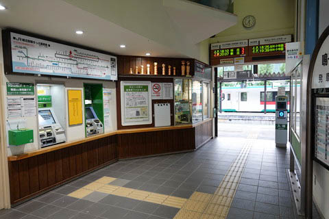 | 駅出入口を入って正面の駅舎内の様子。 自動券売機上部の運賃表右側には、当地特産の 『鳴子こけし』 が飾られている。 |