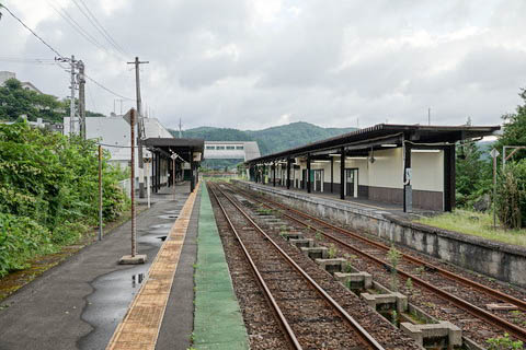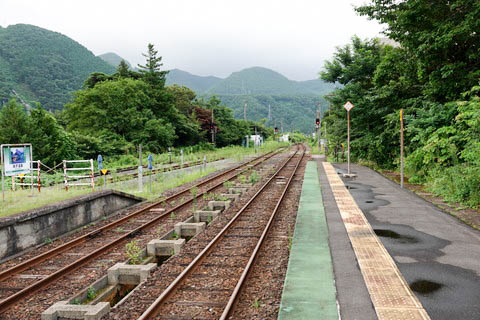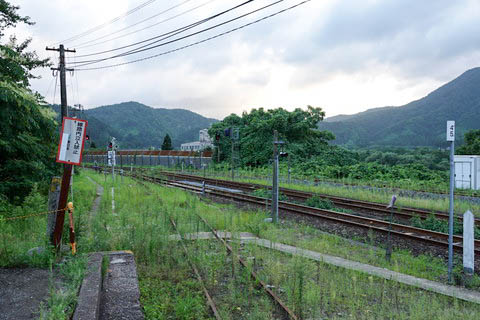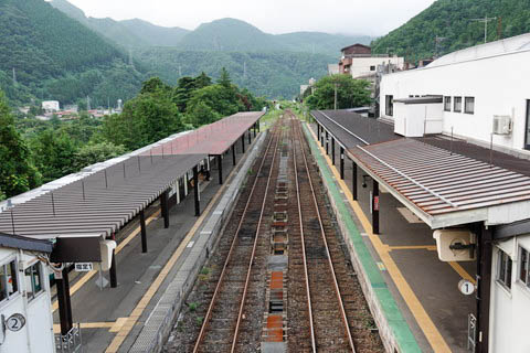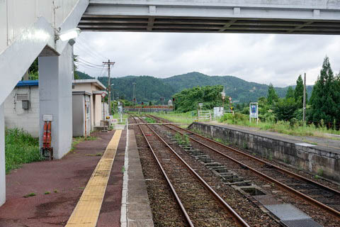 | 構内跨線橋通路より、下り新庄方面を見る。 ホーム先の構内踏切は職員用で、一般立入禁止となっている。 線路は左から下り本線、上り本線、上り副本線である。 前方で下り本線から左に分岐している線路はかつての貨物側線で、 現在は保線車両の留置線になっていると思われる。 また、写真右端で車止めされている側線は旧上り副本線(待避線)で、 かつては上り下り両方向で上り副本線から分岐していたようだ。 |