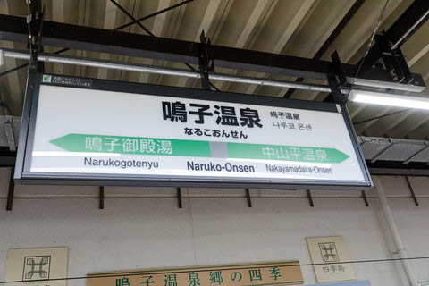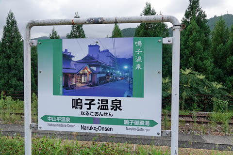| 建植式駅名標。 図柄は、鳴子温泉公衆浴場の 『滝の湯』 と 『湯の街通り』。 『滝の湯』 は、鳴子温泉神社の御神湯として千年の歴史を持つ古湯とのこと。 開業時の駅名は、鳴子温泉の玄関口として 『鳴子』 と命名されたと思われる。 また、『鳴子』 → 『鳴子温泉』 への改称については 観光客誘致のため、 地元の温泉組合による請願説が有力である。 |