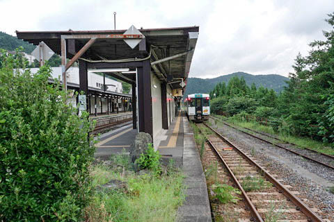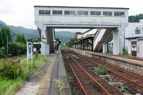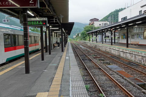 構内跨線橋通路より、上り古川・小牛田方面を見る。 右手が駅舎側単式ホーム、左手が島式ホームで 双方とも長い上屋を有している。 当駅は鳴子温泉の玄関口であり、かつては急行列車も停車しており 400人/日以上の 利用者があったとのこと。 |