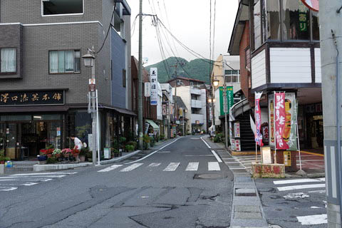 にて北側を見る。 駅は左手へ50m程。 土産物店、飲食店、スーパーなどの商店街となっている。 |