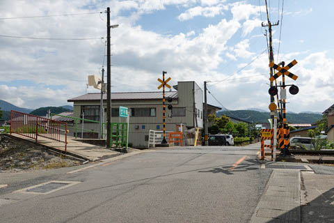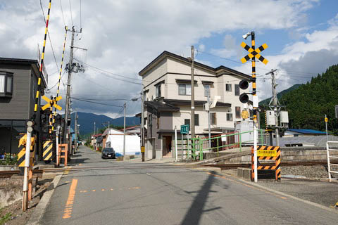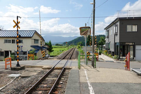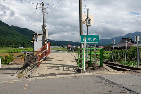 『立小路街道踏切』 を見る。 (南西の小国川方向を見る) 駅は踏切を渡った左手。 |