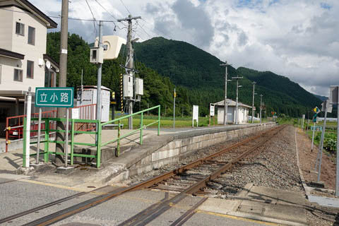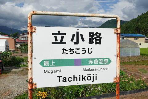 | 建植式駅名標。 駅名は地名の ”最上町大字富沢立小路” より命名されている。 古くは ”最上郡富沢村大字立小路” である。 ”立小路” の”立” は ”盾” と同義で、城砦を表す。 ”小路” は細い道で、 本城岩部の館(小国城)に通じる小路にできた集落を示すとのこと。 |