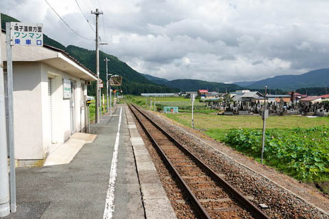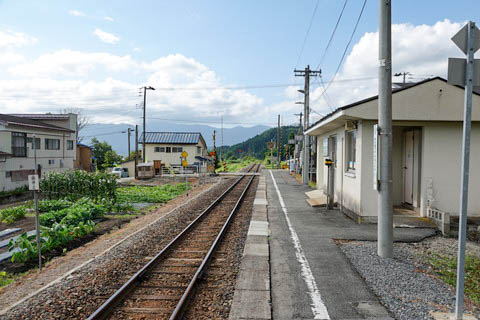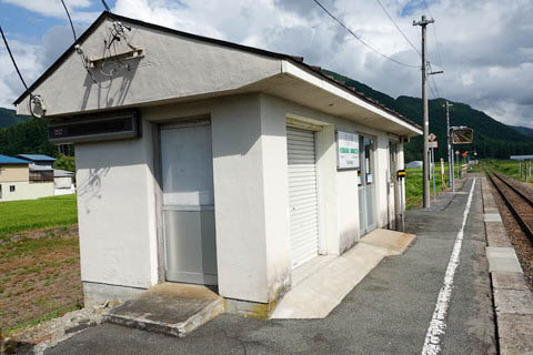 | ホーム中程の上り2両停目脇より、下り新庄方面を見る。 待合室の妻側にトイレの出入口が見える。 |