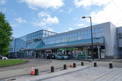駅舎(西口) 正面部分が駅舎で、左手奥に 『最上広域交流センター ゆめりあ』 がある。 |