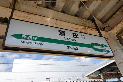 | 吊り下げ型駅名標。 当駅の駅名標は吊り下げ型のみで、建植型の設置はない。 駅名は開業時の地名である”新庄町”より命名されている。 |