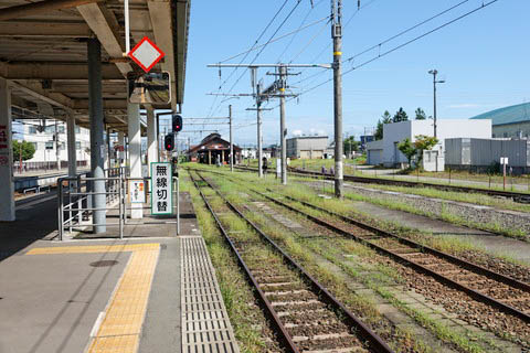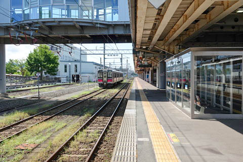 5番のりば北端(終点)から、路線終端方向を見る。 陸羽東線に終点の車止めはなく、線路は奥羽本線下り青森方面および 陸羽西線下り余目方面へ乗り入れが可能な配線となっている。 軌間は狭軌(1,067mm)である。 |