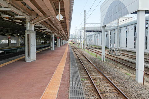 5番のりば中程から、路線終端方向を見る。 左手の2番のりば(線路幅は標準軌)には、9:32発山形行き普通列車が入線してきた。 尚、山形新幹線開業による改軌工事により、構内の配線は複雑化しており、 右手の側線も中間に車止めが設けられ、撮影立ち位置右側が標準軌、 前方に車両(701系)が留置されている所が狭軌となっている。 |