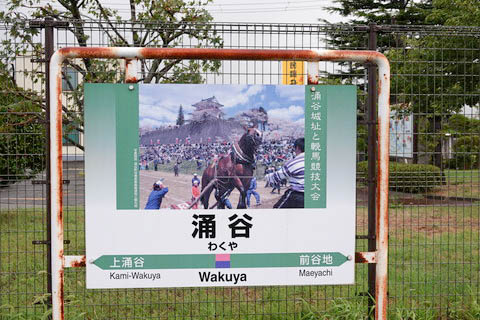| 下り1番のりばの建植式駅名標。。 『涌谷城址と輓馬競技大会』 がプリントされている。 涌谷城は、戦国時代から江戸時代にかけての平山城(ひらやまじろ)で、 現在は城山公園となっている。 涌谷駅の北約1kmにあり徒歩10分程である。 東北輓馬(ばんば)競技大会は、毎年4月の第3日曜日開催される桜まつりの メインイベントとして、城山公園下の江合川河川敷で開催されいるとのこと。 尚、駅名は開業時の町名である 『涌谷町』 より命名されている。 |
