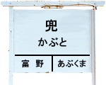 | 建植式駅名標。 駅名の由来は、民話 『河童の年貢』 に出てくる 『兜岩』 が由来との説、 または、周囲にある 『兜橋』、『兜の渡し跡』 からなど、諸説ある。 当駅付近に 『兜』 という地名はない。 |