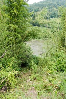 前の市道より、阿武隈川を見る。 渡し場への道は既に自然回帰しており、まったくわからない。 撮影立ち位置から阿武隈川へ直線的に登山道のような急な細道が 延びており、登坂・下降用に補助ロープがつけられている。 一般人が通行するにはかなり危険な道であり、 何らかの理由で後から付けられた道であろう。 市道にはガードレールがあり、たいへんわかりにくい。 |