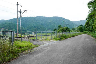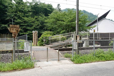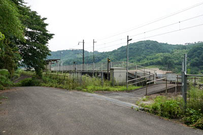 | 駅前の市道より、駅出入口を見る。 駅出入口は線路の向こう側にあり、警報機のみの第三種踏切にて アクセスする。(踏切名不明) |