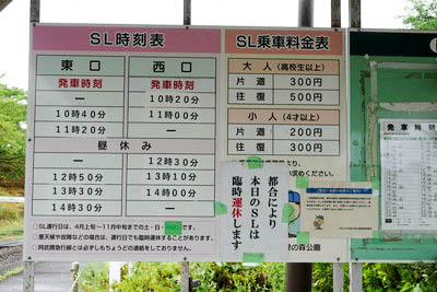 | ※1、7月下旬〜9月中旬までは夏期運休である。 熱中症対策とのことだが、利用客はもとより 熱気にさらされる運転乗務員の健康対策が主であろう。 ※2、2駅間のピストン運行のため、両駅には転車台と機廻し線が設備されている。 |