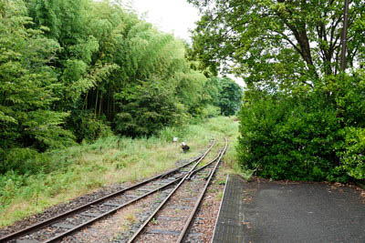 | ホーム南端より転車台を見る。 転車台に建てられたスイッチボックスのボタンを、運転士が 操作することにより電動で動作する仕組みとなっている。 |