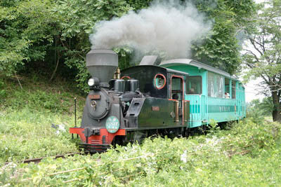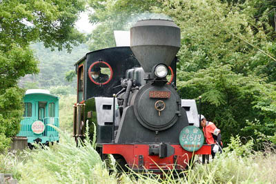 さくら1号。 機関車は1987年(昭和62年)製造、福島県内の協三工業(株)製のB型タンク車で 重さ5.1t、全長4.45m、石炭と油の共用焚きにて走行しているとのこと。 2軸動輪を表す”B”と、昭和62年4月18日の運行開始にちなみ、「B62418」の銘板と 「さくら1号 希望の森公園」のヘッドマークを付け、 3両のボギー客車(定員24名/1両)を 5〜8km/h 程の速度で牽引している。 西口駅から東口駅に向かっては上り勾配のため、 多くの煙を出し汽笛を鳴らして走行する姿が見られる。 |