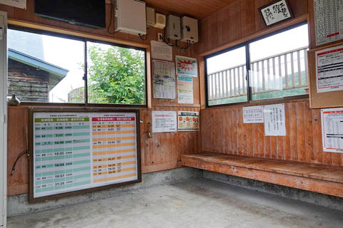 | 待合室内の様子。 三方に窓があるためたいへん明るいが、 スペースの関係で発車時刻表の掲示位置が窓の下になっている。 |