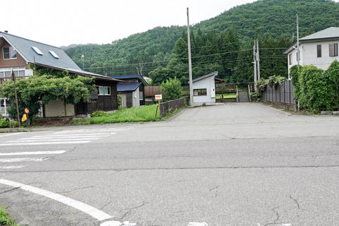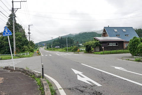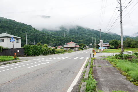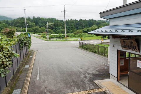 | 駅前を通る国道121号線にて南側(栃木県方面・山王峠側)を見る。 駅は左手奥で、十字路を右へ 『会津山村道場うさぎの森キャンプ場』・『奥会津博物館』 方面である。 国道沿いも含め民家・店舗はまばらである。 |