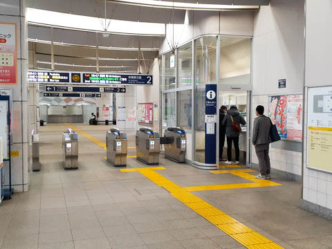 | 自由通路から改札口を見る。 有人窓口はガラス張りのウォークイン方式となっている。 |