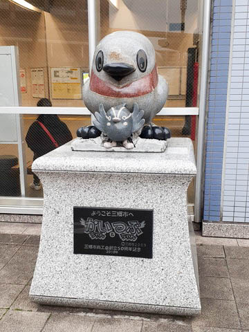 『かいちゃん&つぶちゃん』 の石像がある。 2010年(平成22年)12月21日に除幕式が行われ、三郷市役所、新三郷駅と当駅の3ヶ所に 設置されている。 市の鳥である 『かいつぶり』 がモチーフとのこと。 ちなみに大きい方が 『かいちゃん』、小さい方が 『つぶちゃん』。 |