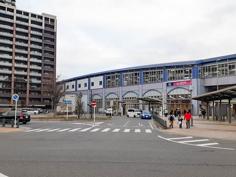 西口出入口(写真左手)。 高架駅のためプラットホームは2Fにあり、出入口はホームの南端部に位置している。 駅の自由通路脇に歩道の自由通路が並行している。 |