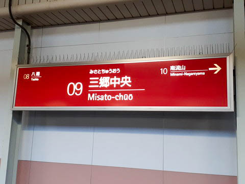 | 壁面用駅名標。 開業前の2000年(平成12年)に駅名公募が行われ、 最終的に 『三郷中央』 が採用されている。 理由は、『駅が三郷市の中央部に位置していること』 を反映したもので、それに伴い 駅がある地名も、2015年(平成27年)に現在の 『中央一丁目 に変更されている。 尚、開業前の仮称駅名は 『三郷』。 |
