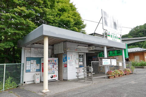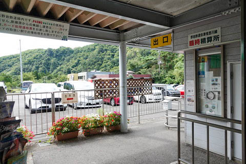 駅舎。 日光市営 『龍王峡パーキング』 (無料駐車場)の北側に面している。 軒下の小さな ”入口” 看板の所に 『臨時きっぷうりば』 と改札ラチがある。 改札は 『臨時きっぷうりば』 の窓口にて行っている。 |