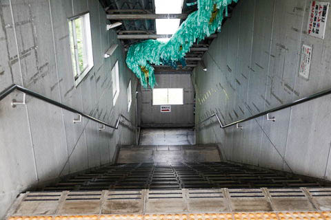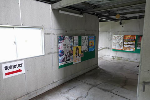| 当駅にはエレベーターの設置がないため、階段壁面に手書きの案内表示がある。 | ||||||||||||||||||||||||||||||||||||||||||||||||||||||||||||||||||