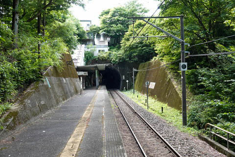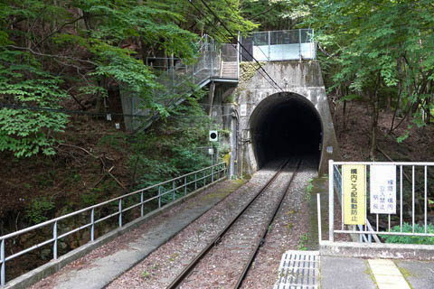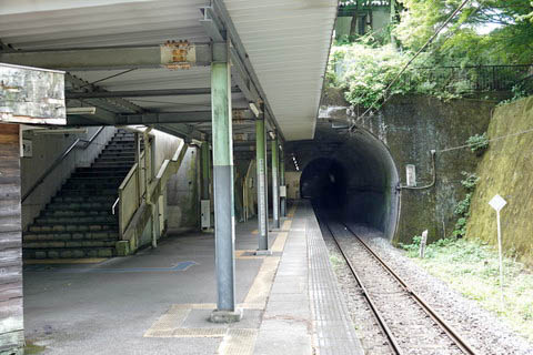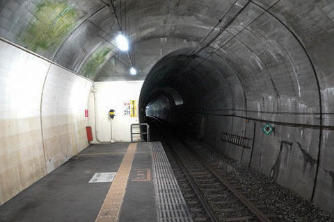 | ホーム北端(川治温泉寄り)から、下り会津高原尾瀬口・田島方面を見る。 ホーム先すぐに延長2668m の 『小網トンネル』 が口を開けている。 また、写真ではわからないが、ホーム端とトンネルの間に 鬼怒川の枝沢である ”野沢” が流れており、右手に ”龍王峡ハイキングコース” の小さな橋が架かっている。 ハイキング路は 『小網トンネル』 入口部の真上を通り、鬼怒川方面へ続いている。 |