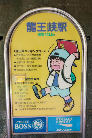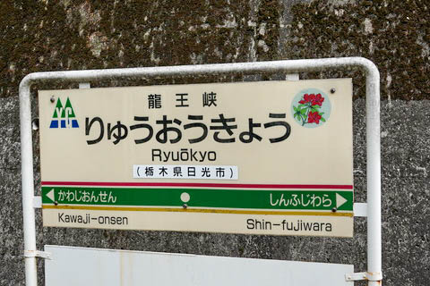| 吊り下げ型駅名標。 駅名は直近の 『龍王峡』 より命名されている。 『龍王峡』 は鬼怒川の景勝地で、火山岩が約3kmに亘って浸食されてできた峡谷で、 険しい岩盤が露出し、さながら竜が暴れ回ったような形跡を残すことから 『龍王峡』 と名付けられている。 |