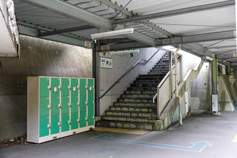 | ホームと改札口の連絡階段。 列車利用にて 『龍王峡』 を散策する乗客のためのコインロッカーが設置されている。 |