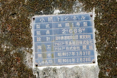 入口部にある ”トンネル銘板”。 施工は 『飛島建設(とびしまけんせつ)』 と 『間組(はざまぐみ)』 で、 2社が二手に分かれて 両側から掘り進めたということかな? |