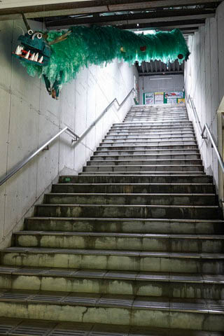 | ホーム側階段下から、改札口方向を見る。 天井にいるのは竜? |