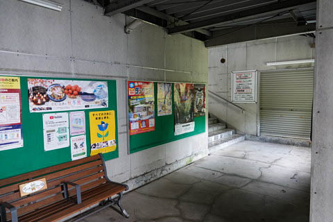| 連絡階段の踊り場にて改札口側を見る。 ベンチが置かれ、背もたれ部分に 「ちょっと一福」 とある。 列車の待合用ではなく、休憩用に設置されているようだ。 |