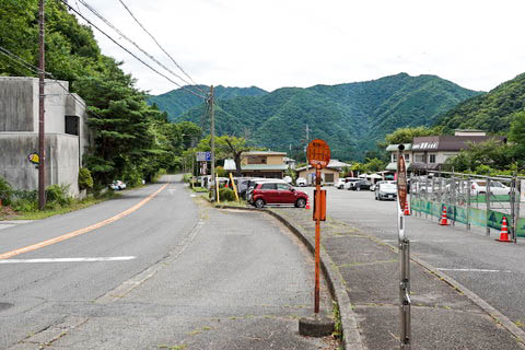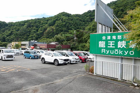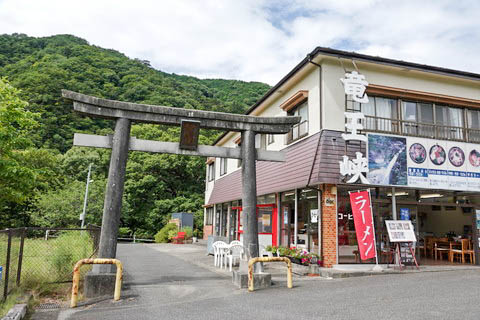『龍王峡パーキング』 南側にある 『龍王峡』 入口。 『五龍王神社』 の鳥居が有り、その参道が 『龍王峡』 へのアクセス路で、 遊歩道(ハイキングコース)の一部ともなっている。 駐車場が広いため、少しわかりづらい位置にある。 |