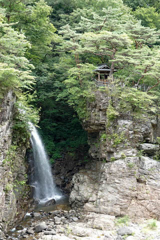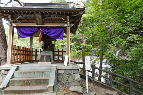 拝殿。 鬼怒川・川治温泉の守り神とされる 『龍王神』 を祀った神社である。 神社の右手奥に 『虹見の滝』 が見えている。 |