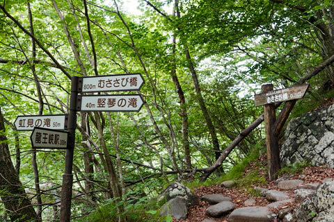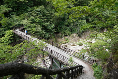 『虹見橋』。 橋の先に 『むささび橋』 方面へ遊歩道(ハイキングコース)が延びている。 この橋まで下らずに 『五龍王神社』 を見て引き返す観光客も多くいる。 |