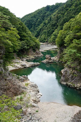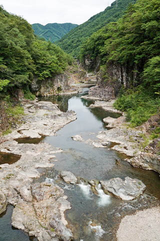 から上流側(川治温泉方面)を見る。 『龍王峡』 は、上流から2,200万年前の海底火山の爆発で 安山岩が流れ出して形成された 『紫龍ヶ渕』、 『紫龍ヶ渕』 の上に火山灰が体積して出来た 『青龍峡』、 さらに、その上に白っぽい流紋岩が流出した 『白龍峡』 と 大きく3つの区画に分けられ、『虹見橋』 から見えるのは 『白龍峡』 である。 |