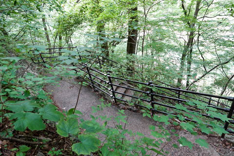 へはつづら折りの階段・坂道を下っていく。 土産物・飲食店での道案内を聞き、行くのを躊躇する観光客も少なからずいるようだ。 |