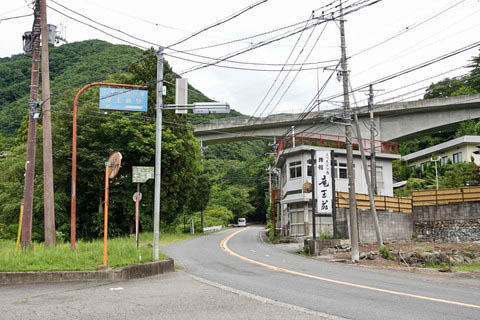 | 駅前を通る国道121号線にて、北側の川治温泉方面を見る。 写真では文字が見づらいが、道路脇に 『←龍王峡駅』 の青い案内表示がある。 正面で国道をオーバーパスしている高架橋は、栃木県道19号藤原塩原線 (ふじはらしおばらせん)で、かつて有料道路であった 『日塩もみじライン』 である。 2020年(令和2年)12月11日に無料開放され、現在は県道になっている。 |