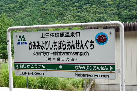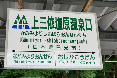 | 建植型駅名標。 駅名は漢字8文字の長さであり、漢字のみの駅名では長さ日本一タイである。 (他にも8文字駅は複数ある) 駅名は 『下野上三依』 ⇒ 『上三依塩原』 ⇒ 『上三依塩原温泉口』 と 2回 改称されている。 |