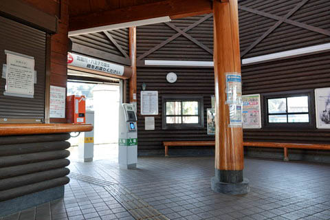 駅舎内の様子。 シャッターが下りているが、有人駅時代の出札窓口が残っている。 |