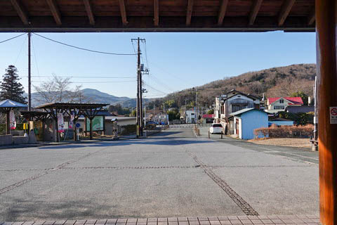 | 駅舎前より西へ延びる駅前通りは、延長64mの 『埼玉県道188号明覚停車場線』 である。 正面奥に小さく白い建物が見えるところを、左右(南北に) 『埼玉県道172号大野東松山線』 が走っている。 |